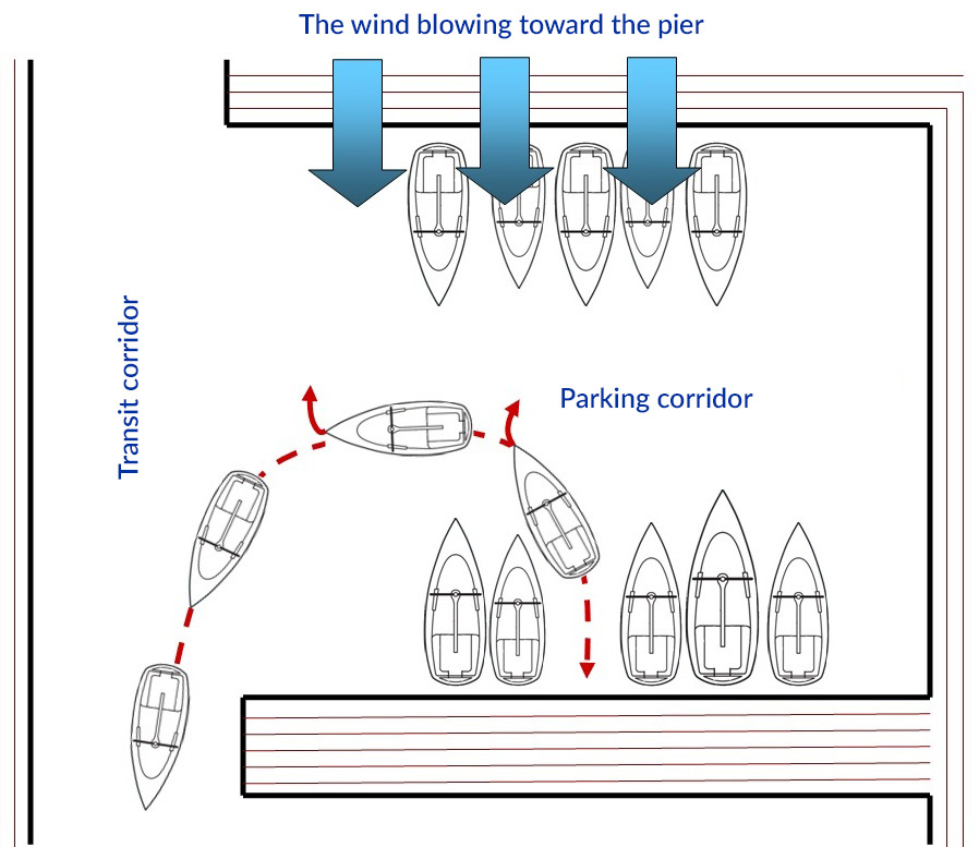 compensating for the undesirable wind effect. The boat approaches the dock along the
