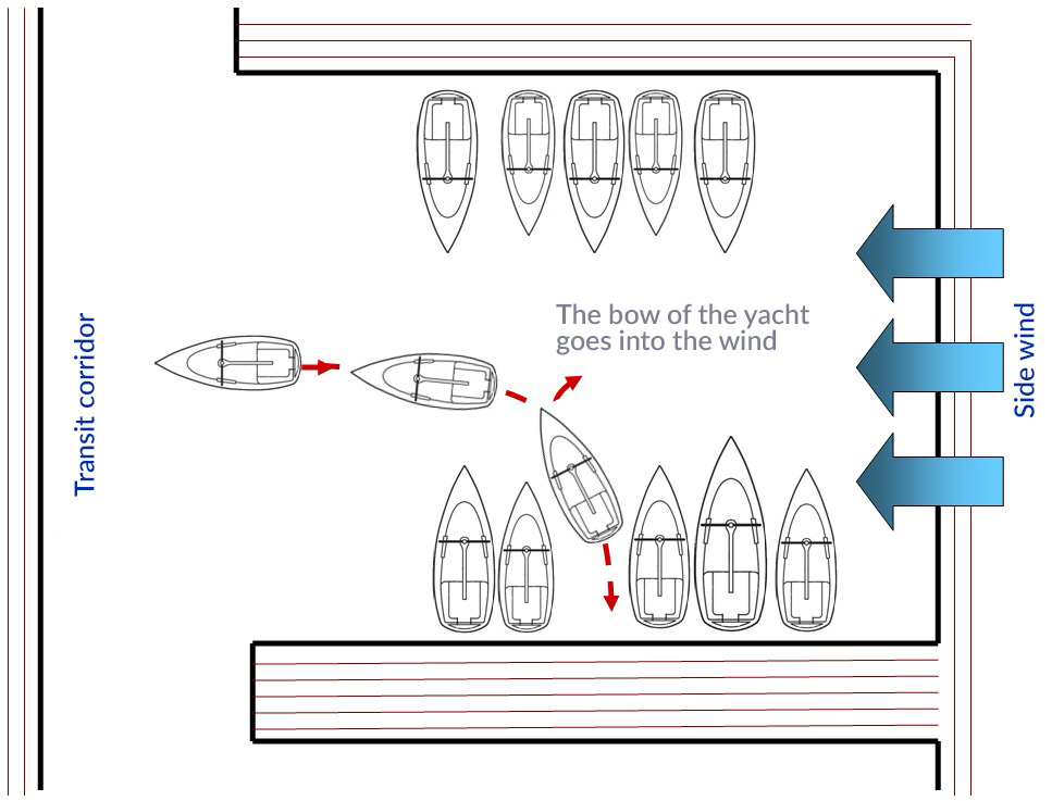 approach. When moving stern-first towards the mooring spot, the yacht follows a